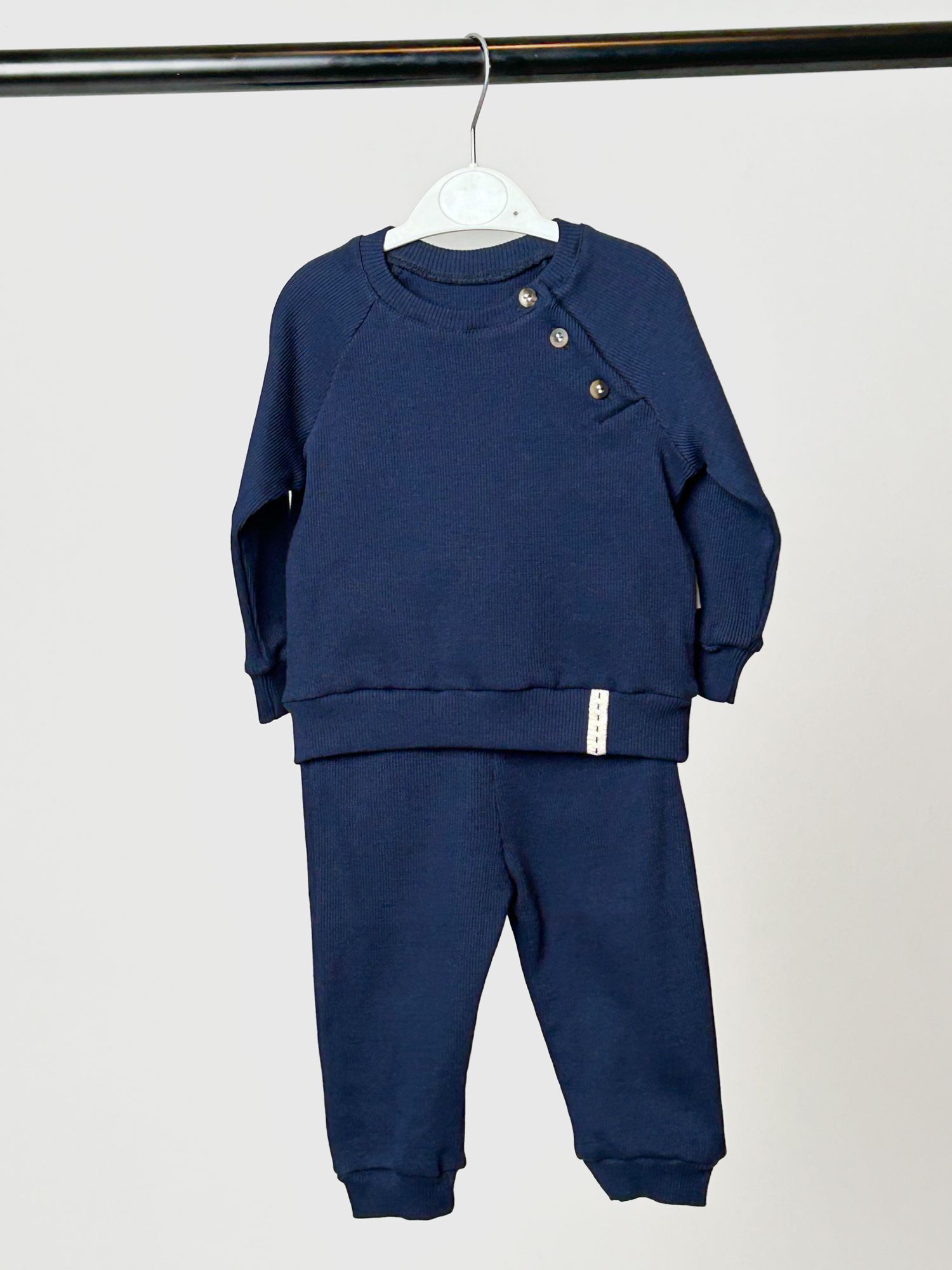 Set uni bleumarin, cu un look curat și modern. Detaliul cu nasturi decorativi pe umăr este discret și frumos. Croiala lejeră oferă confort, iar manșetele fixează ușor mânecile și baza. Pantalonii au talie elastică și manșete pentru o așezare comodă. Se potrivește ușor cu un body și o vestă sau sub un combinezon.