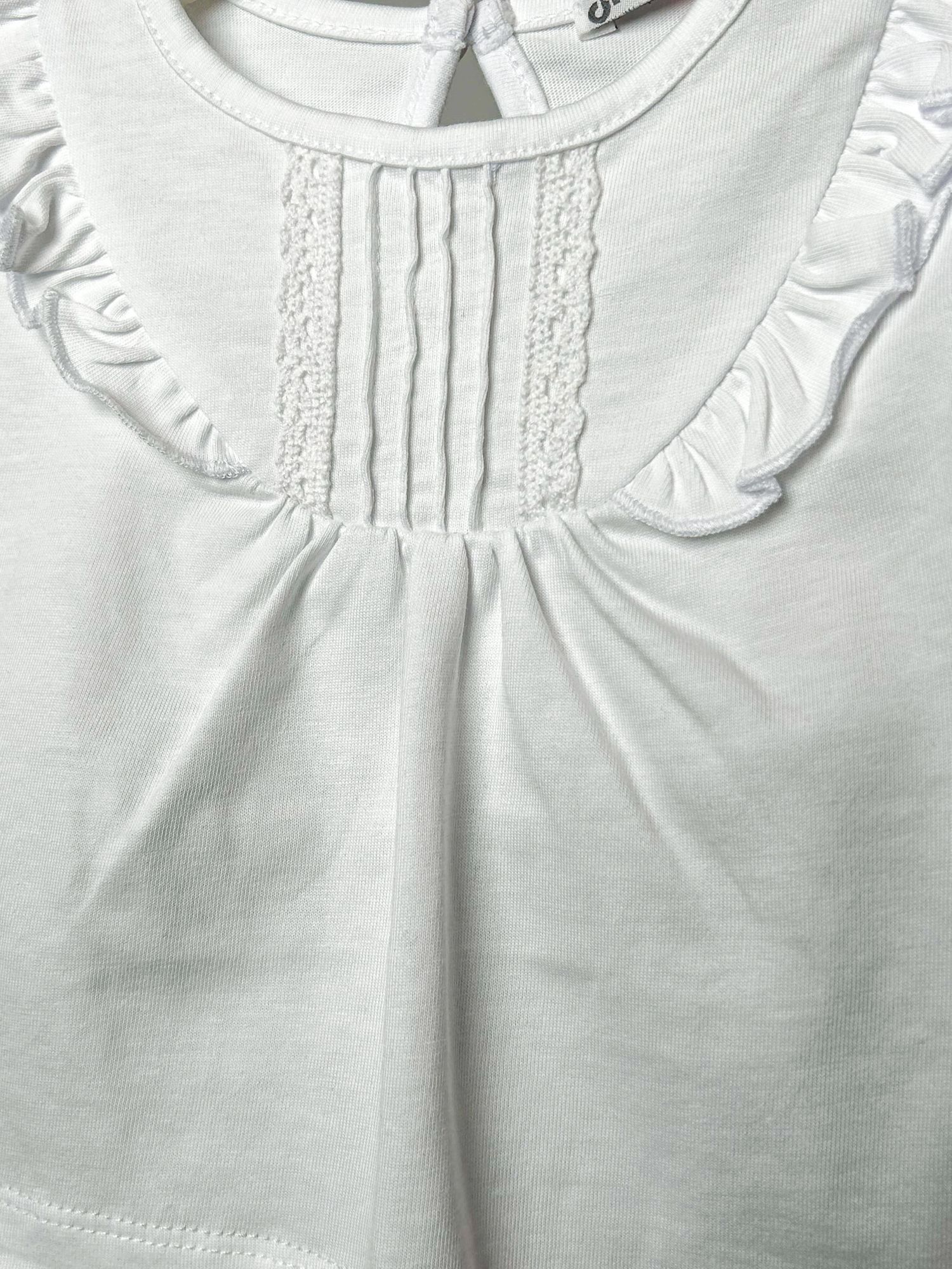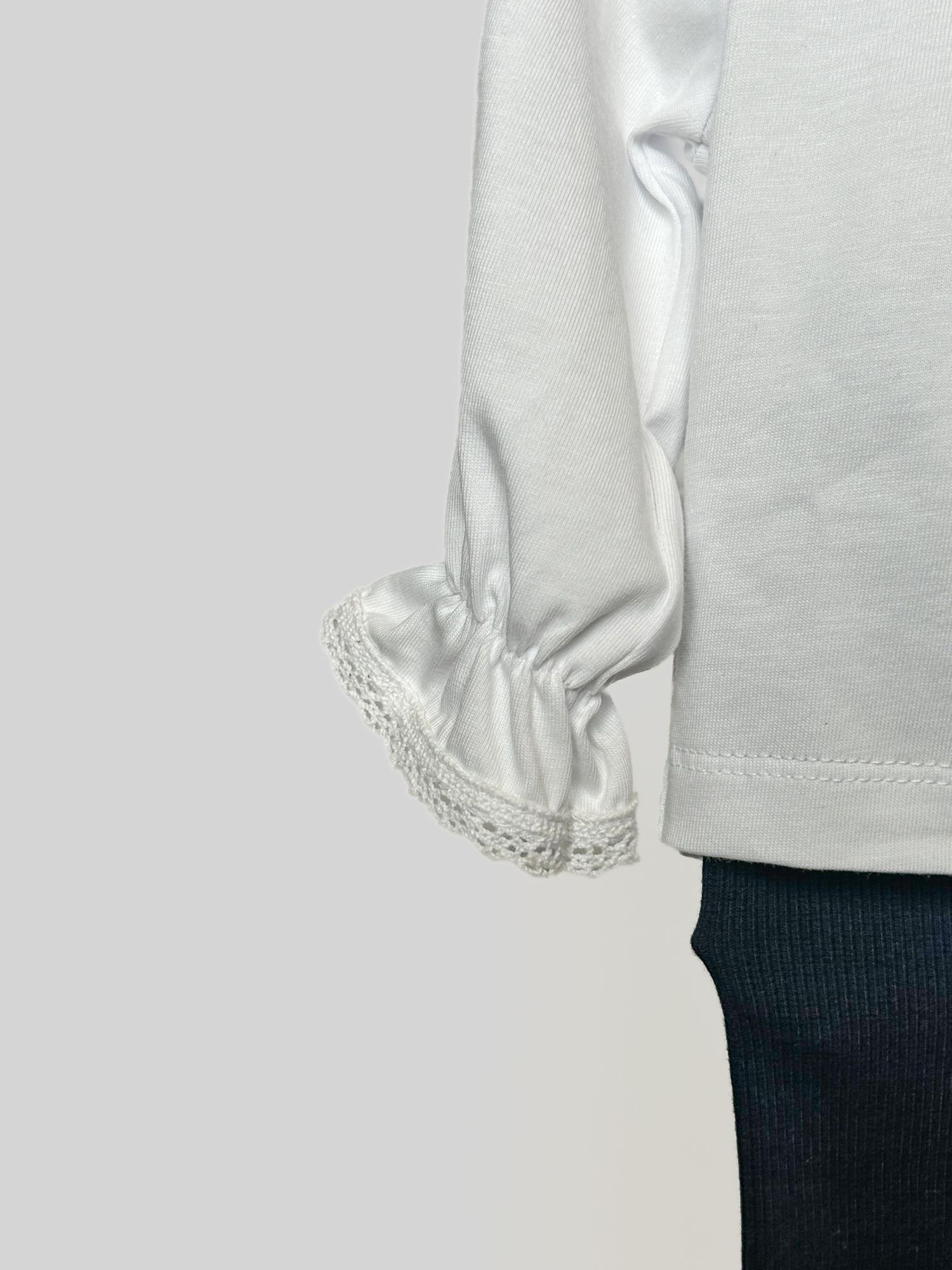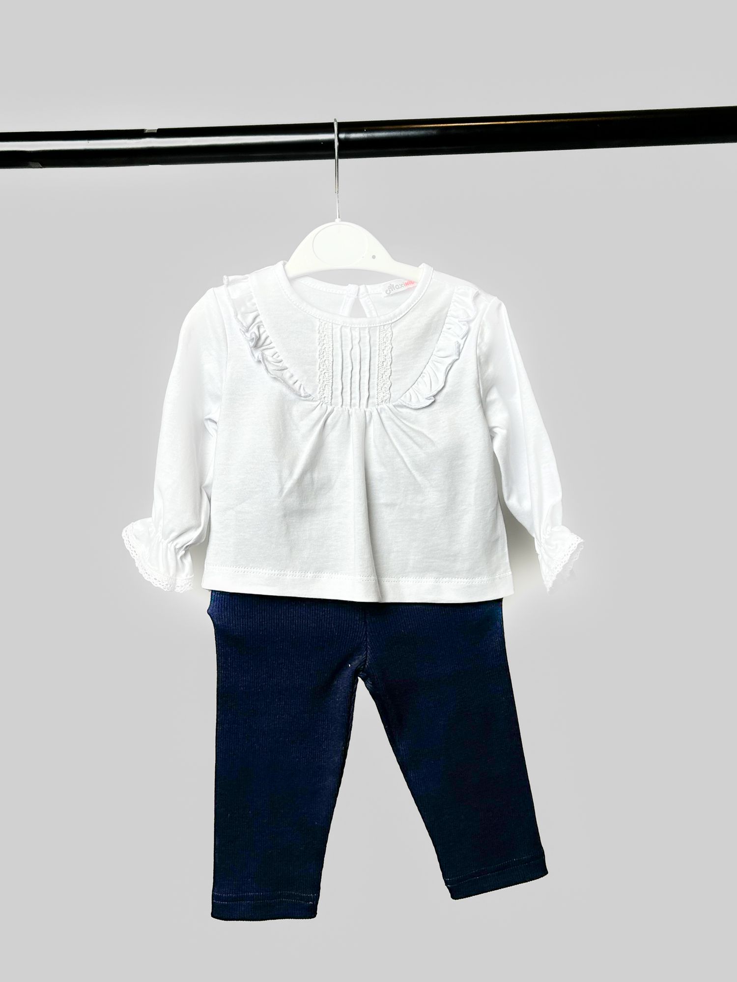 Set cu bluză albă și colanți bleumarin, cu un look curat și „aranjat”. Bluza are guler rotunjit cu volănaș fin și un detaliu plisat pe piept, accent delicat. Mânecile sunt ușor bufante, cu manșete elastice și margine din dantelă. Colanții sunt simpli, bleumarin, ușor de asortat și potriviți pentru ținute de zi cu zi. Un set comod, care arată frumos atât la plimbare, cât și la evenimente.