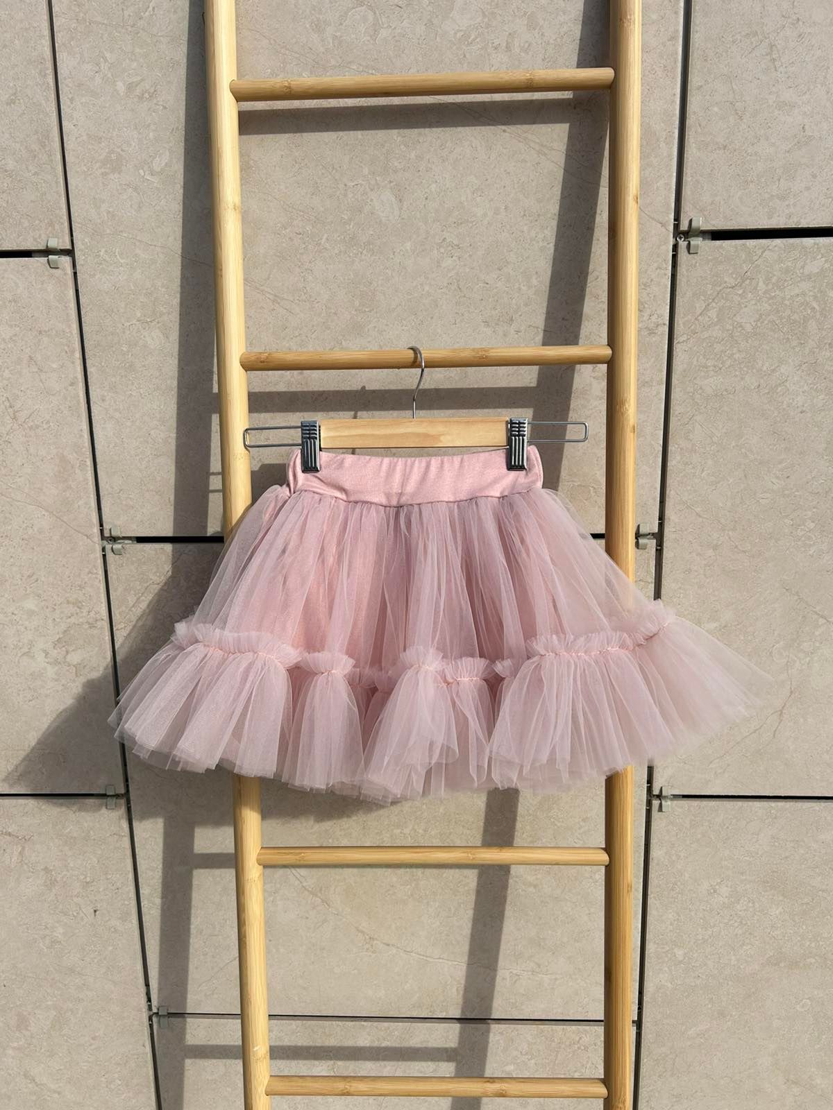 Fustă vaporoasă pentru fete din tul moale. Talie elastică pentru o potrivire confortabilă, model ușor și elegant, ideal pentru ocazii speciale sau ținute de zi cu zi. Culoare roz delicat.