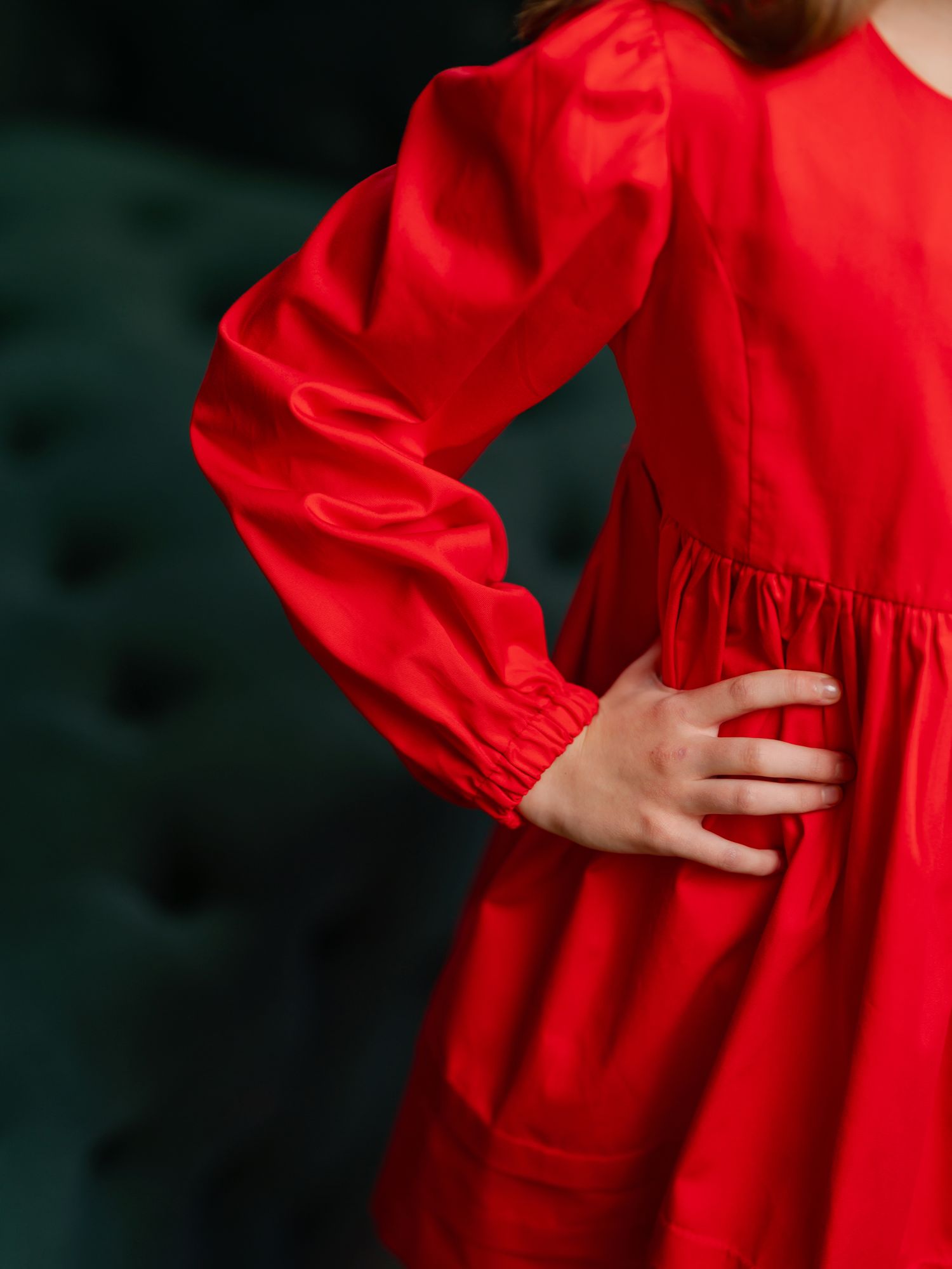 Rochie elegantă, cu croi lejer și mâneci bufante, cu elastic la tivul mânecii. Se închide la spate cu fermoar ascuns. Confortabilă și practică, potrivită pentru ocazii speciale.