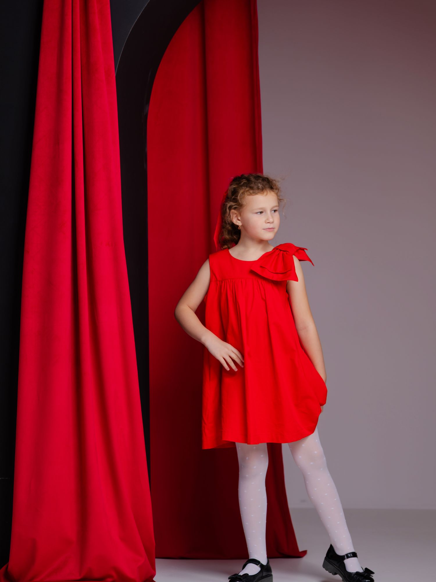 Rochie festivă roșie, ideală pentru sărbători și ocazii speciale. Design lejer, cu fundă elegantă pe umăr, confecționată din material confortabil și plăcut la purtare. Perfectă pentru un look de sărbătoare.