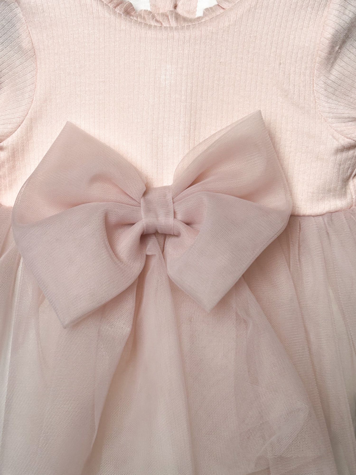 Нарядное платье. Нежный пудровый оттенок, мягкий трикотажный верх с длинным рукавом и пышная фатиновая юбка. Украшено большим элегантным бантом. Комфортное, лёгкое и идеально подходит для праздников и фотосессий.